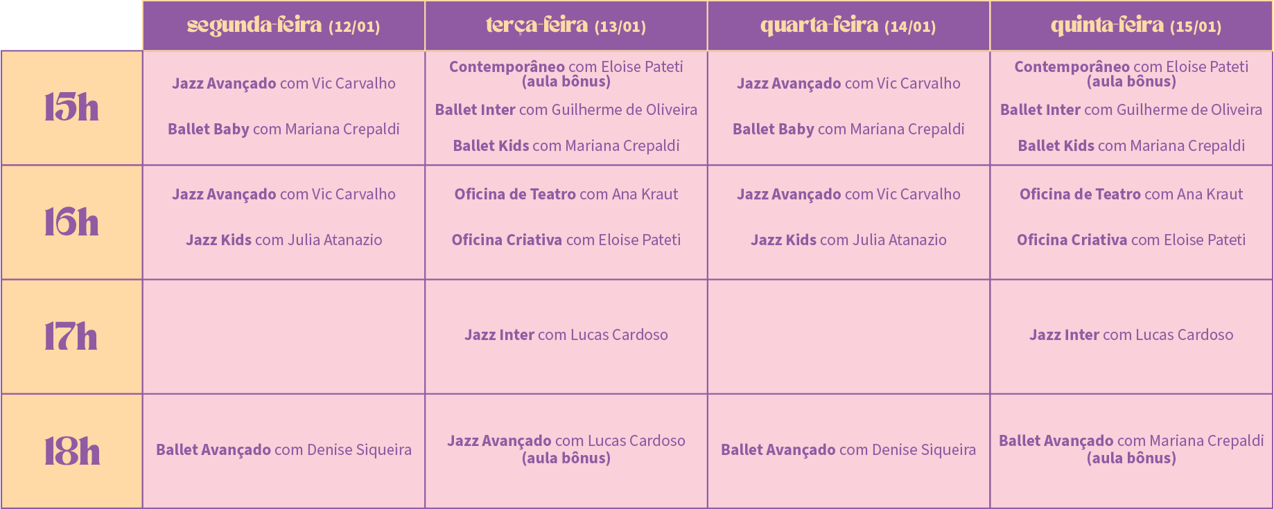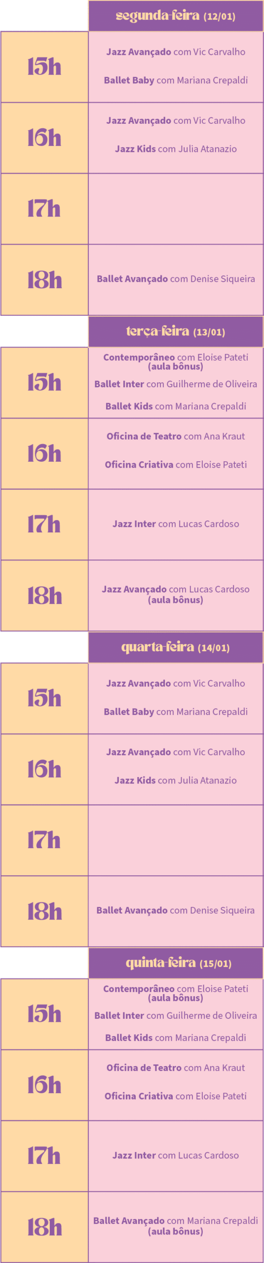 12 e 14/01, das 15h às 16h30