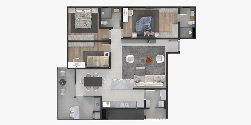 3 Quartos, sendo 1 suíte. 127,19 m² privativos e 2 vagas de garagem.