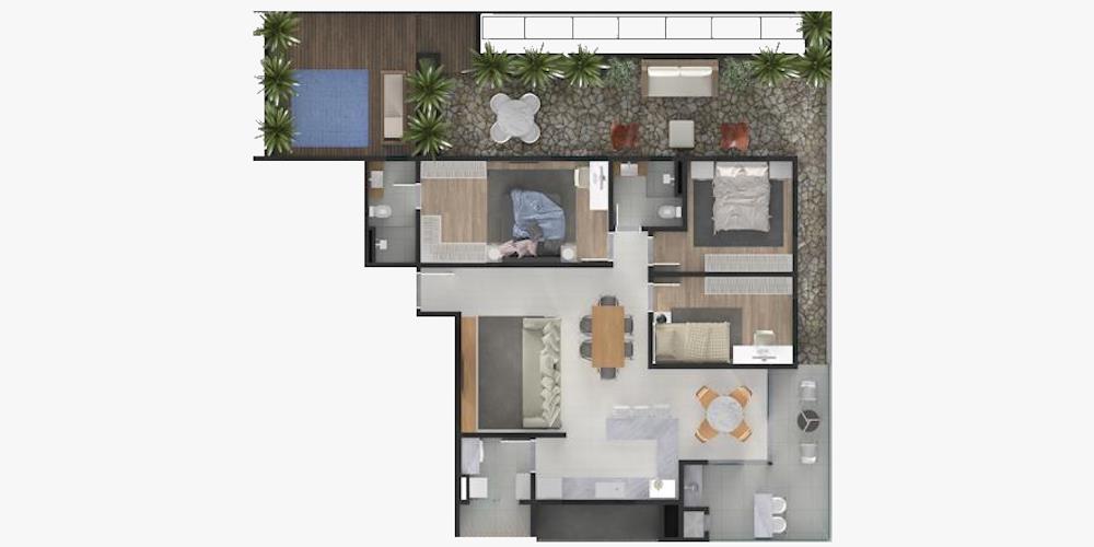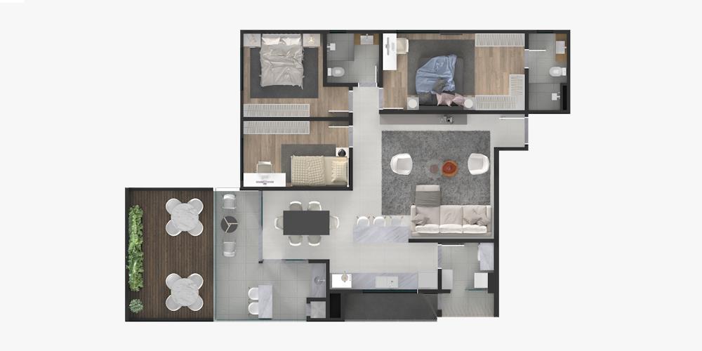 3 Quartos, sendo 1 suíte. 179,41 m² privativos e 2 vagas de garagem.